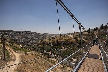 Image: View of a rope bridge crossing from the Ben Hinnom valley to Mount Zion, in the Old city of Jerusalem, on July 30, 2023. Photo by Chaim Goldberg/Flash90.