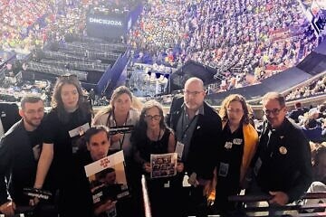 Images: Families of American hostages who have been held in the Gaza Strip since the Hamas terrorist attacks in southern Israel on Oct. 7, at the Democratic National Convention in Chicago, August 2024. Credit: Courtesy of Ruby Chen.
