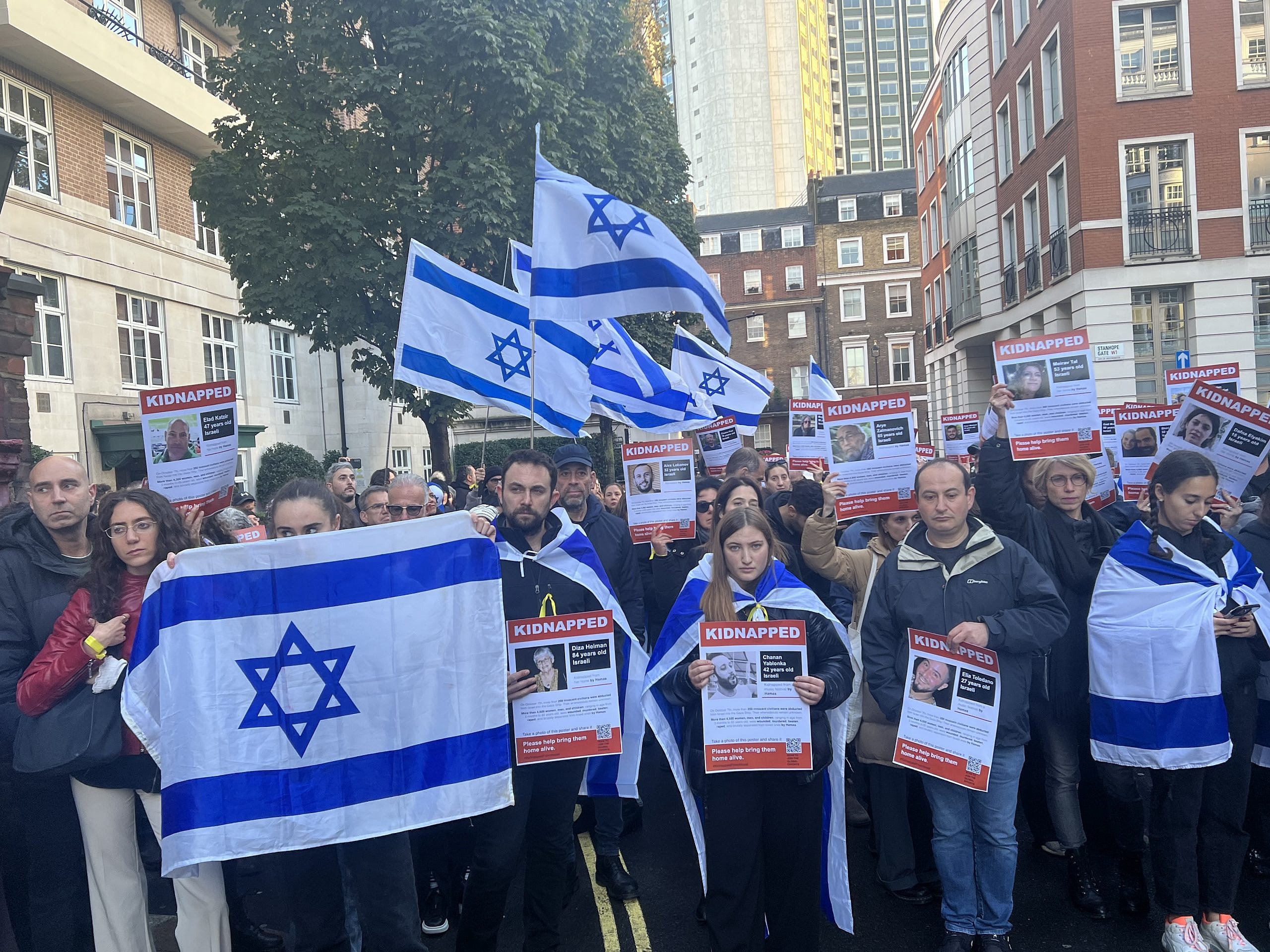 Some 300 people gathered outside the Qatari embassy in London on Sunday, demanding the immediate and safe return of the hostages whom Hamas terrorists kidnapped on Oct. 7.