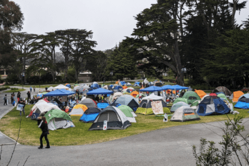 Image: A tent encampment supporting Hamas and Palestinians in the Gaza Strip on the quad of San Francisco State University, May 3, 2024. Credit: Mariwlqs via Wikimedia Commons.